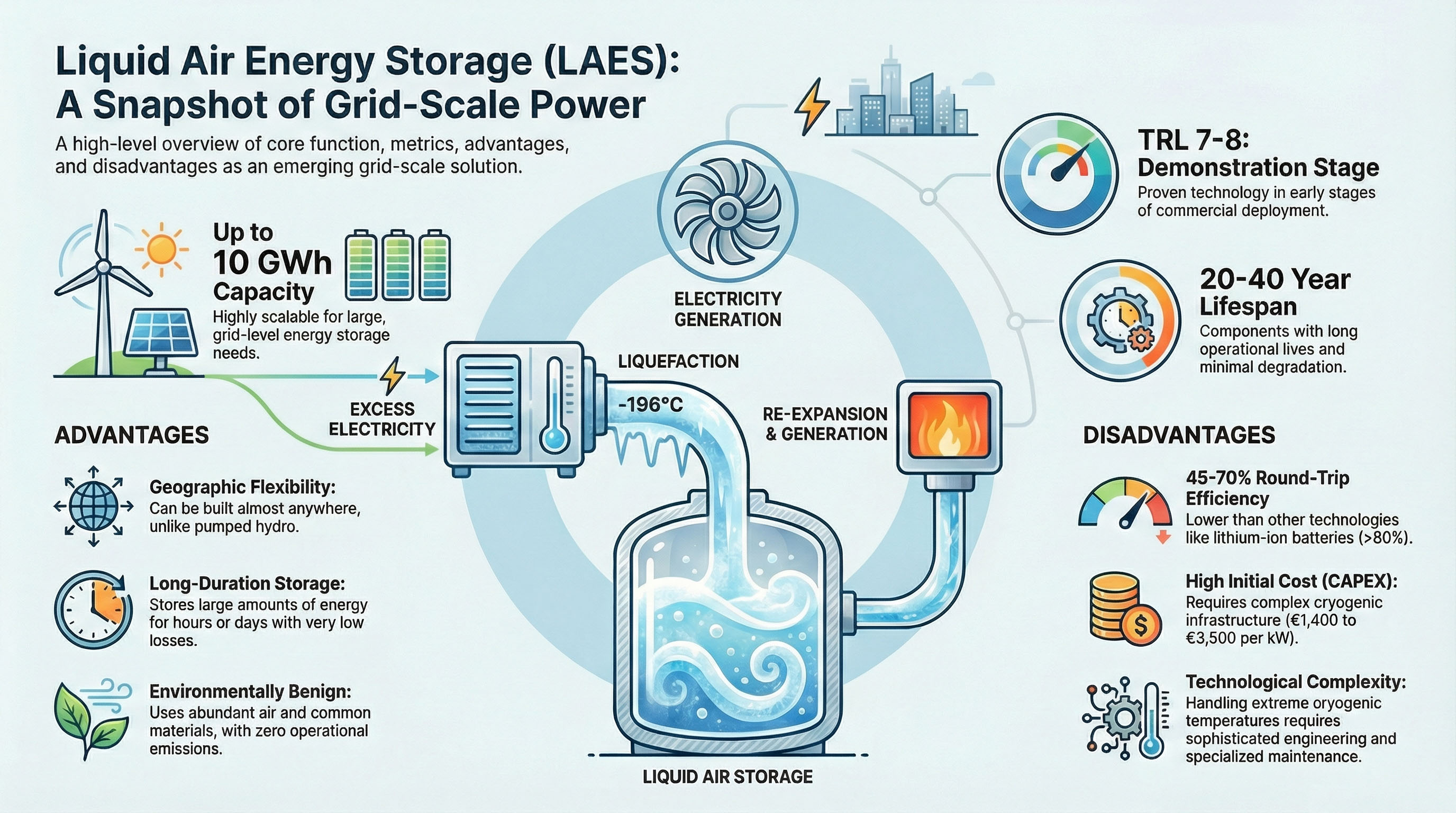 Liquid Air Energy Storage (LAES) turns surplus electricity into cryogenic liquid air, stores it in insulated tanks, and later converts it back into electricity on demand. The result is a large-scale, long-duration storage option that can be deployed without the geographic constraints of pumped hydro or cavern-based storage.